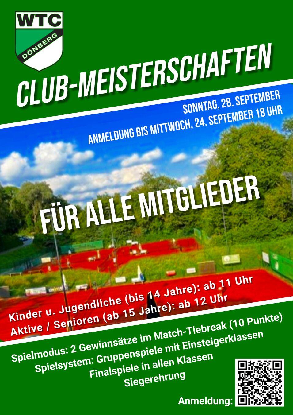 zum Abschluss der Sommersaison 2025 laden wir Euch herzlich zu unseren internen Club-Meisterschaften am Sonntag, den 28. September auf unserer Anlage ein. Das Turnier richtet sich an alle Mitglieder – sowohl an Kinder und Jugendliche bis einschließlich 14 Jahre als auch an Aktive und Senioren ab 15 Jahren, unabhängig vom Erfahrungsstand.